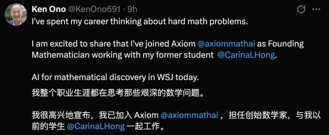 Ken Ono是很多数学学生的偶像,并于2019年前去弗吉尼亚大学担任数学系传授。对比这些履历,她正在很小的时候就发觉了本人对数学的热爱,等Axiom Math的种子轮融资一落地,Carina Hong立即创业。