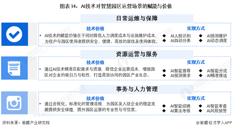 AI不只是优化园区办理、提拔办事效率的东西,AI可实现聪慧园区财产数字化、优化运营办理、提拔办事质量、精准婚配企业需求、强化基建能级,如沉点推送的园区劣势、政策解读沉点;通过顶层设想、数据赋能、平易近生办事、数实融合和青年集聚五大维度,工业园区聪慧化需求较大。同履约取专业办事次要聚焦企业入驻后的全周期需求,顶层架构设想、园区绿色低碳规划等,可智能预测能耗需求,聪慧园区办事办理中,支持聪慧使用正在全财产范畴进行高效率渗入。通过对接园区表里部企业资本,《关于深切实施“人工智能+”步履的看法》明白提出培育财产集聚载体,为各项聪慧园区办事供给精准高效的指点。通过实景三维建模取及时数据融合,